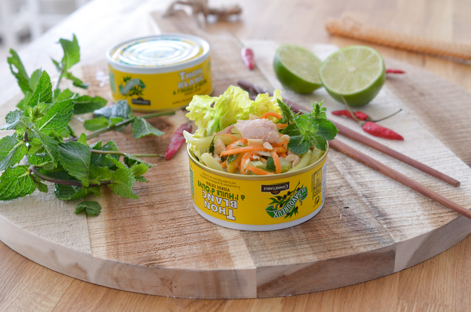 Voici donc une salade comme j’en fait souvent : très simple à faire et pleine de saveurs. Le principe ? Quelques légumes croquants, une source de protéines (ici du thon, mais cette recette se marie aussi à merveille avec du poulet, des crevettes …), et une sauce thaï que vous pouvez réutiliser sur pas mal de préparations. Pour parfaire le tout j’y ai mis une touche de mangue qui vient adoucir le piment, et quelques cacahuètes croquantes pour la texture en bouche.