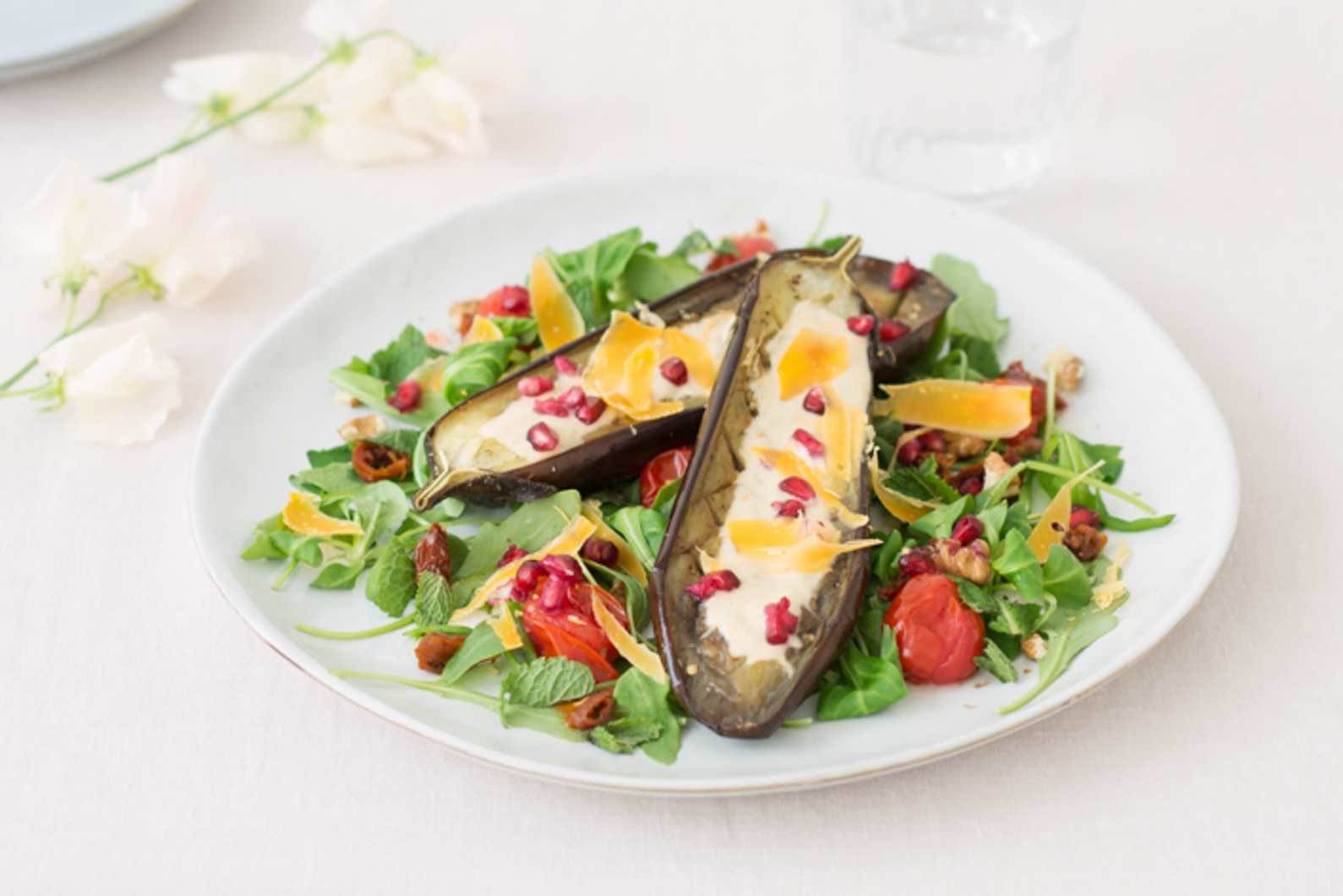 J’ai donc décliné la recette en version salade avec des aubergines rôties, une sauce au yaourt au miso et à l’érable, des herbes fraiches, quelques noix croquantes et une touche de mimolette vieille.
