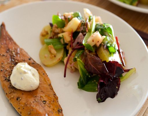 - Incorporez la salade de jeunes, mélangez brièvement et servez immédiatement avec une viande grillé ou des filets de maquereaux fumés, comme sur la photo.