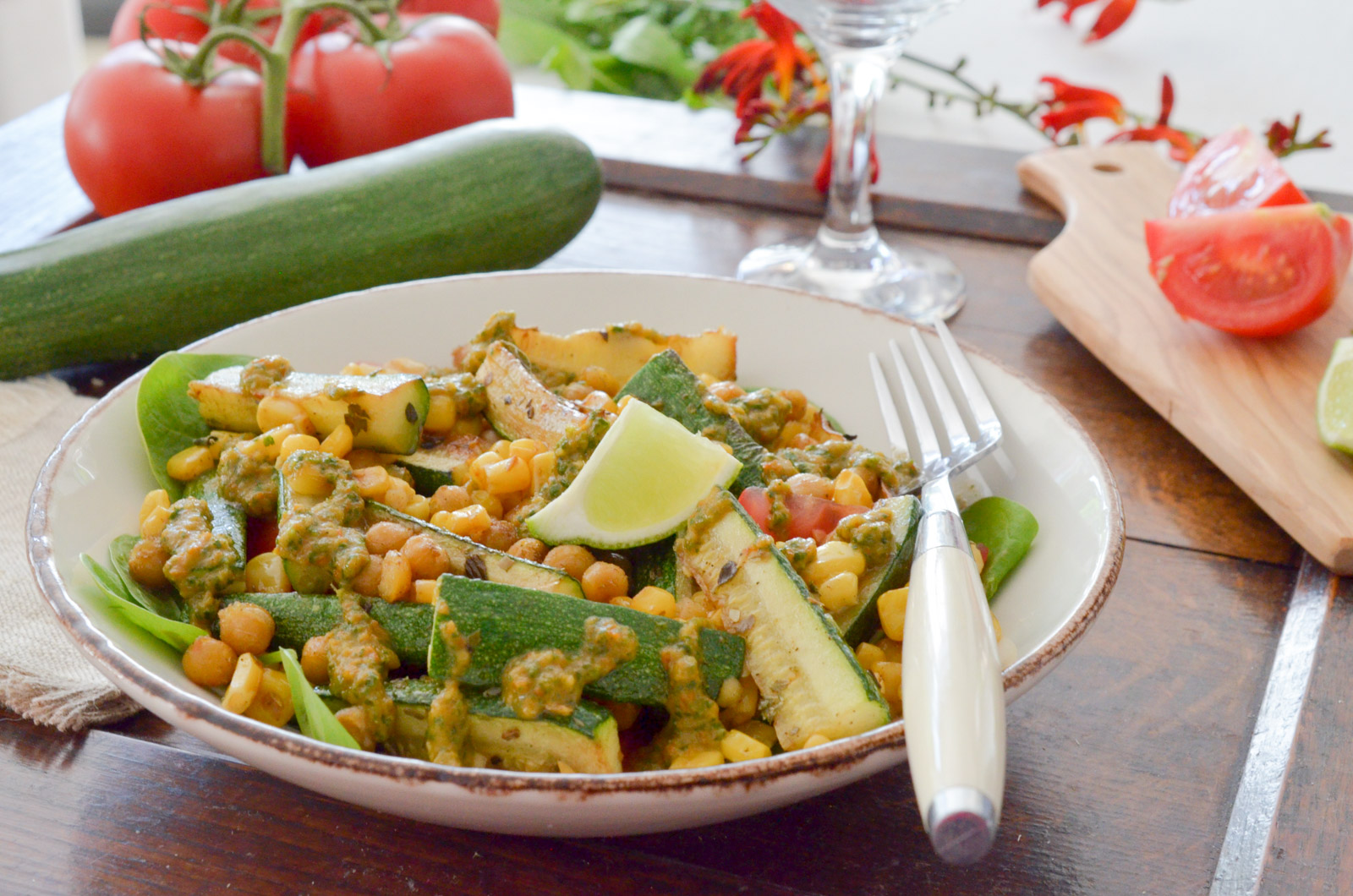 Dans vos assiettes de service, disposez un lit de pousses d’épinards, les légumes grillés juste tiédis, les tomates coupez en tranches, et terminez par les pois chiches grillés. Arrosez de sauce et servez immédiatement avec des quartiers de citron vert.