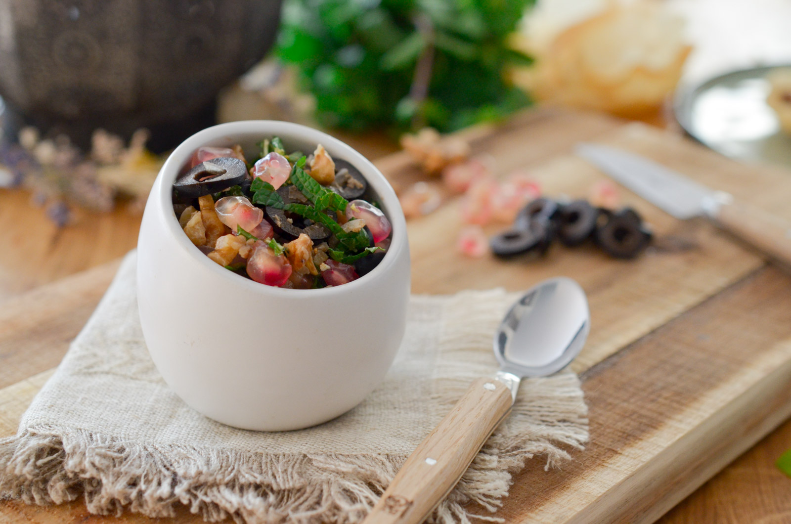 Vous l’aurez compris, il s’agit là d’une sauce croquante, presque comme un petit tartare de légumes que j’ai réalisée avec des olives Hojablanca, une variété originaire des régions de Séville, Cordoue et Nord Malaga. Une olive d’Espagne, LE pays des olives, qui se marie très bien avec mon mélange gourmand à base de noix, de grenade pétillante et de quelques herbes fraiches. A déguster sans modération ;-)
