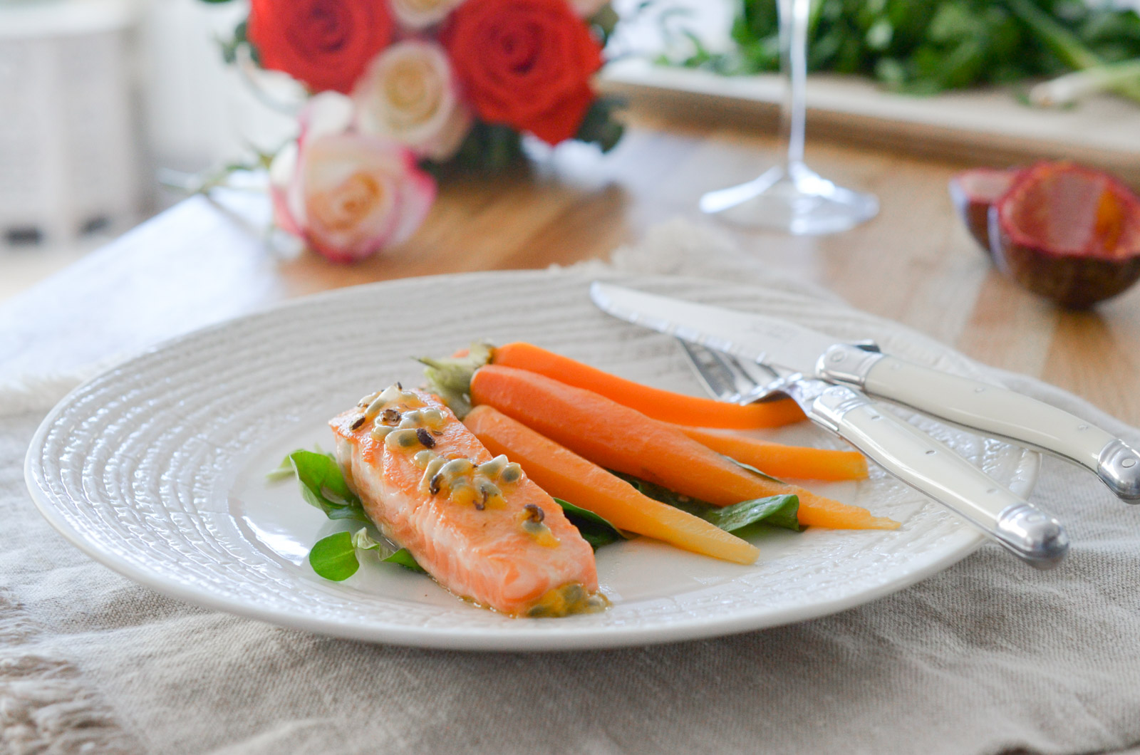 Voilà une recette magique ! La vinaigrette à la passion avec son petit goût acidulé est une petite merveille, bien fruitée, qui se marie aussi bien avec le saumon, comme ici, qu’avec des saint jacques, un ceviche ou encore une volaille juste grillée. Côté légumes, elle se mariera à la perfection avec des carottes ou des asperges. J’y ajoute en toute fin de recette une touche de baie de Timut, aussi appelé Poivre pamplemousse… un poivre comme vous n’en n’avez jamais senti, ni gouté.