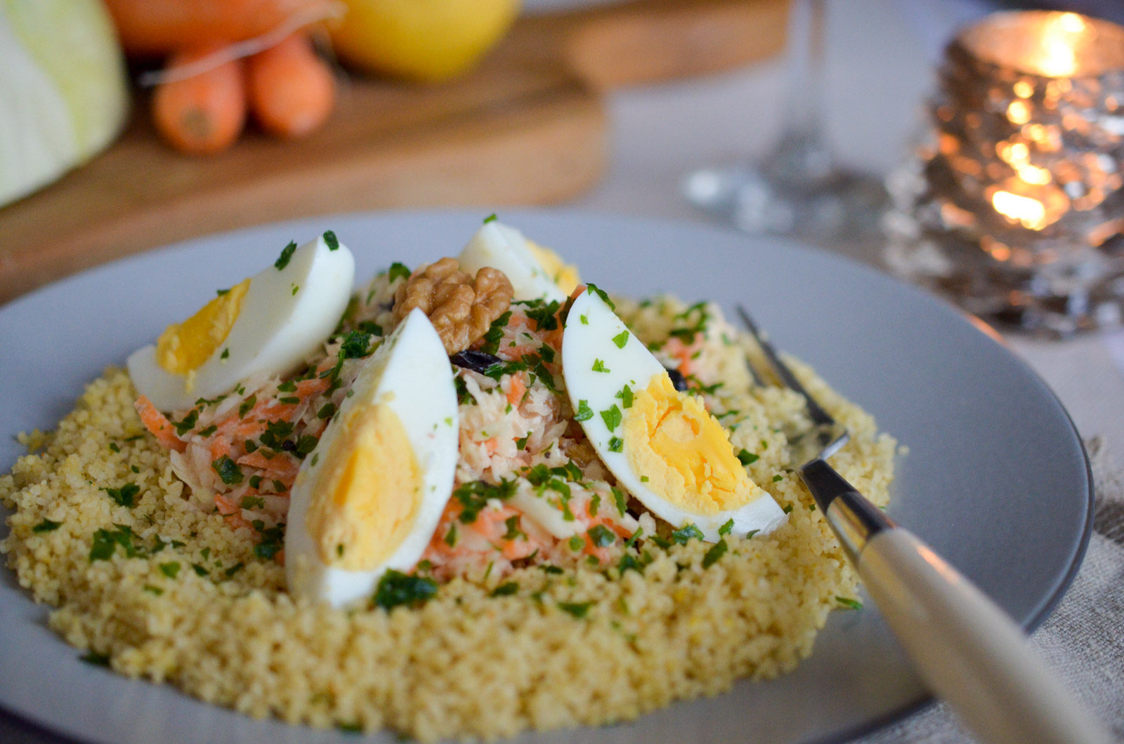 Dans vos assiettes de services, égrenez la couscous, ajoutez la salade de chou, un oeuf coupé en 4 par assiette, et terminez en parsemant de persil ciselé. Dégustez bien frais.