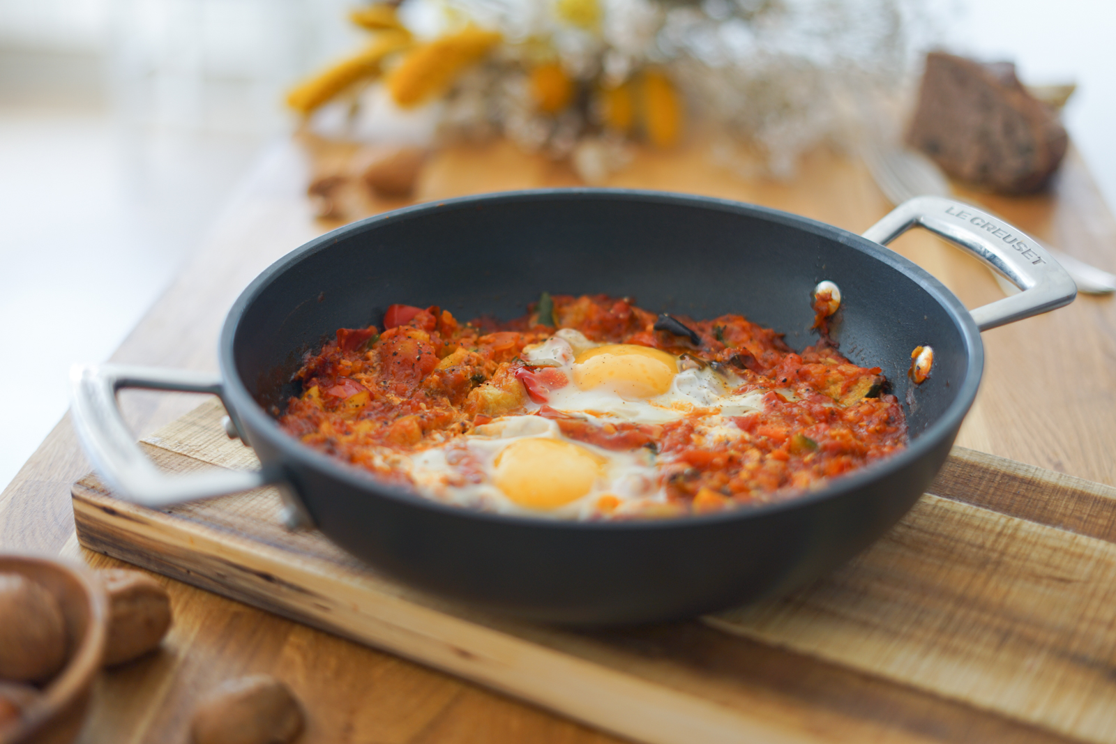 Bon alors je ne sais toujours pas très bien si je dois mettre en intitulé shakshouka, tchatchouka, shakshouka, chakchouka, ou je ne sais quoi… mais tout ce que je sais c’est que c’est simple et que c’est bon.