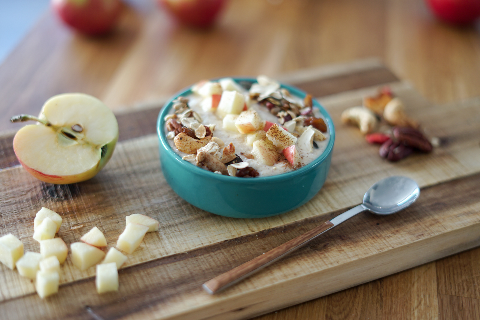 - Disposez dans votre préparation dans des bols et parsemez de dés de pomme et de granola. Si vous aimez, ajoutez une pointe de cannelle.