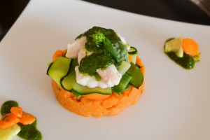 - Sur vos assiettes de présentation, à l'aide d'un cercle, disposez un lit d'écrasée de patate douce, rajoutez quelques légumes croquants et surmontez d'un beau filet de sole.