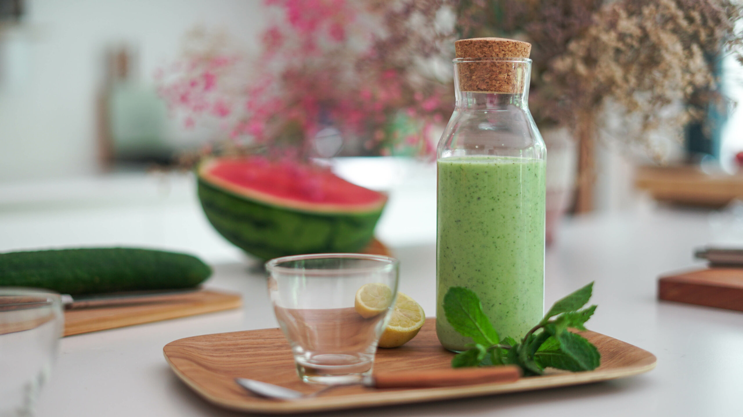- Servez bien frais dans des mini verrines, parsemées de dés de concombre, de graines, de quelques feuilles de menthe et d’un trait d’huile d’olive.