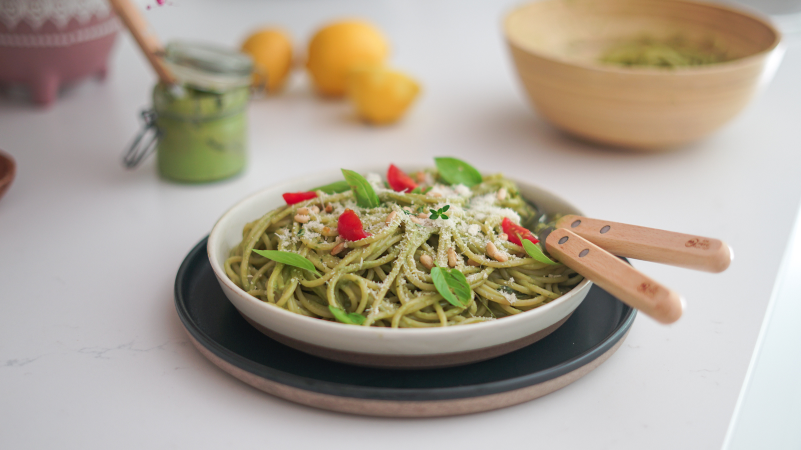 - Servez immédiatement avec un peu de parmesan râpé, quelques pignons, des feuilles de basilic et quelques tomates cerises juste coupées en deux si vous le souhaitez.