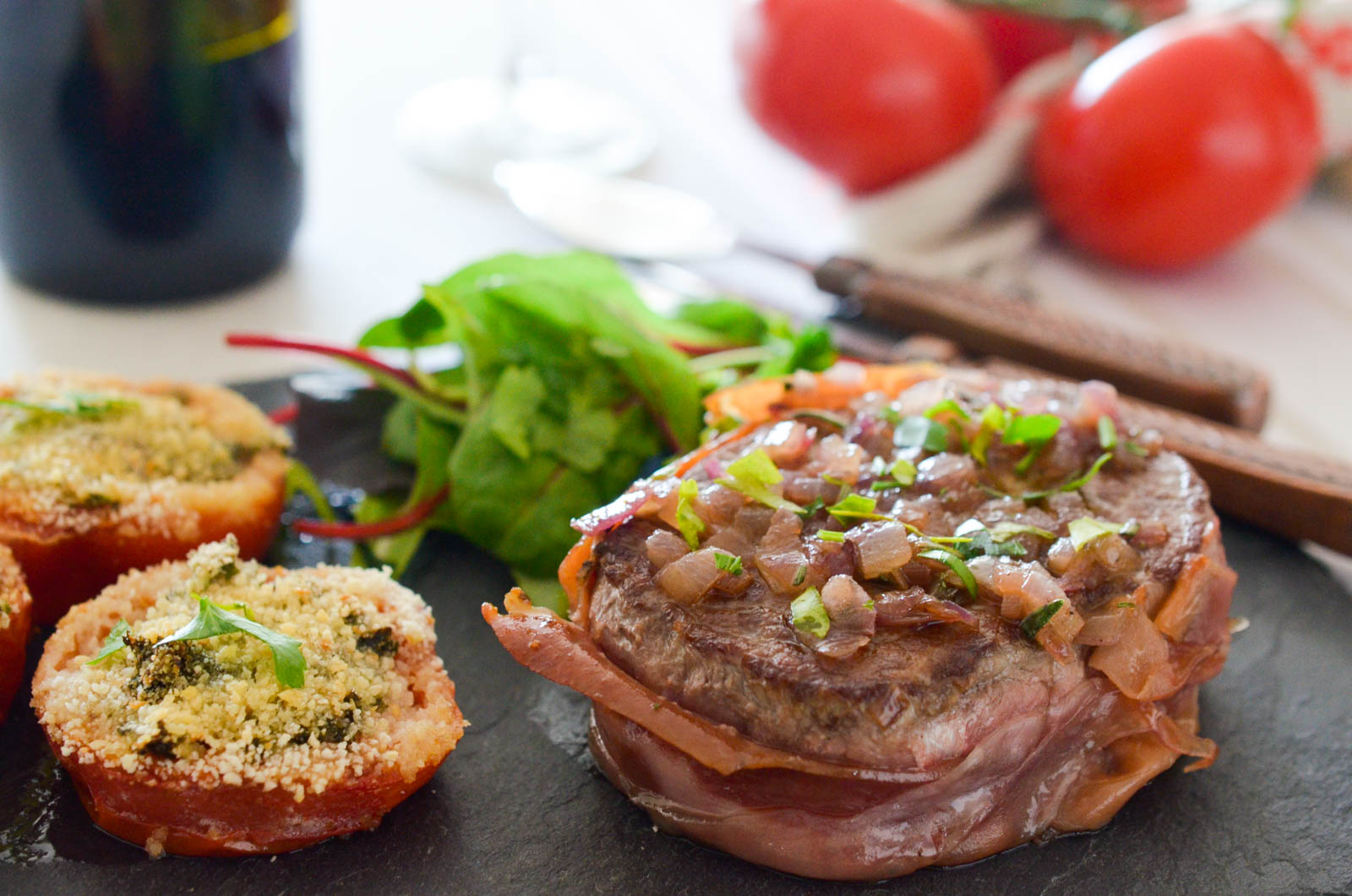 Servez les steaks avec les tomates provençales rôties parsemées du restant de persil. Pensez à bien enlever la ficelle à rôti avant le service.