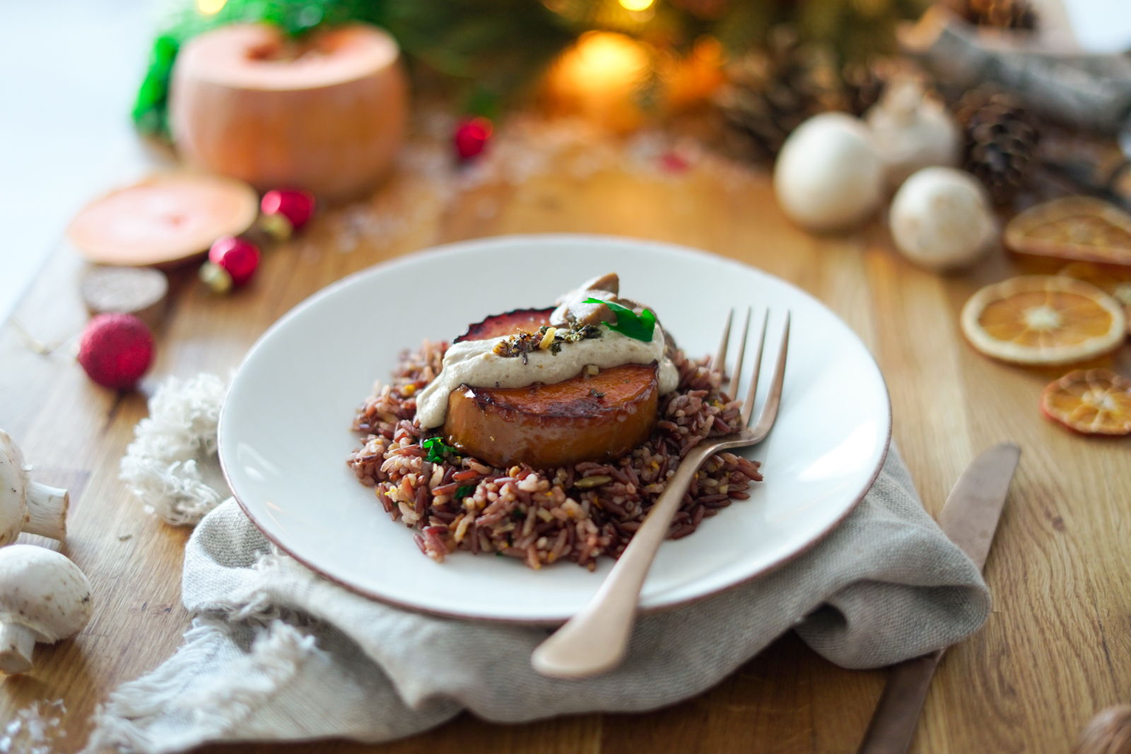 La preuve avec ma recette de « steaks » de butternut à la crème de cèpes, servi avec un riz croustillant parfumé aux graines, aux herbes et à l’orange.