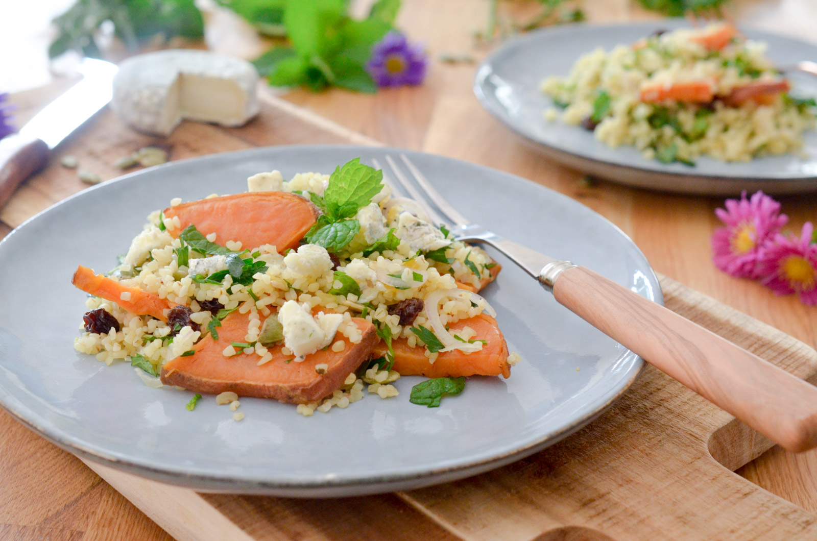 Comment fait on en hiver pour manger du taboulé alors que ce n’est pas du tout la saison ni de la tomate, ni du concombre ? Et bien on transforme la recette avec des produits de saison, et c’est très bon ! Ici j’ai choisi de la patate douce (mais vous pouvez aussi tester avec de la courge ou une butternut par exemple), et j’y ai ajouté un petit côté sucré salé apporté par les raisins secs, et de la générosité avec le fromage de chèvre. Vous m’en direz des nouvelles !