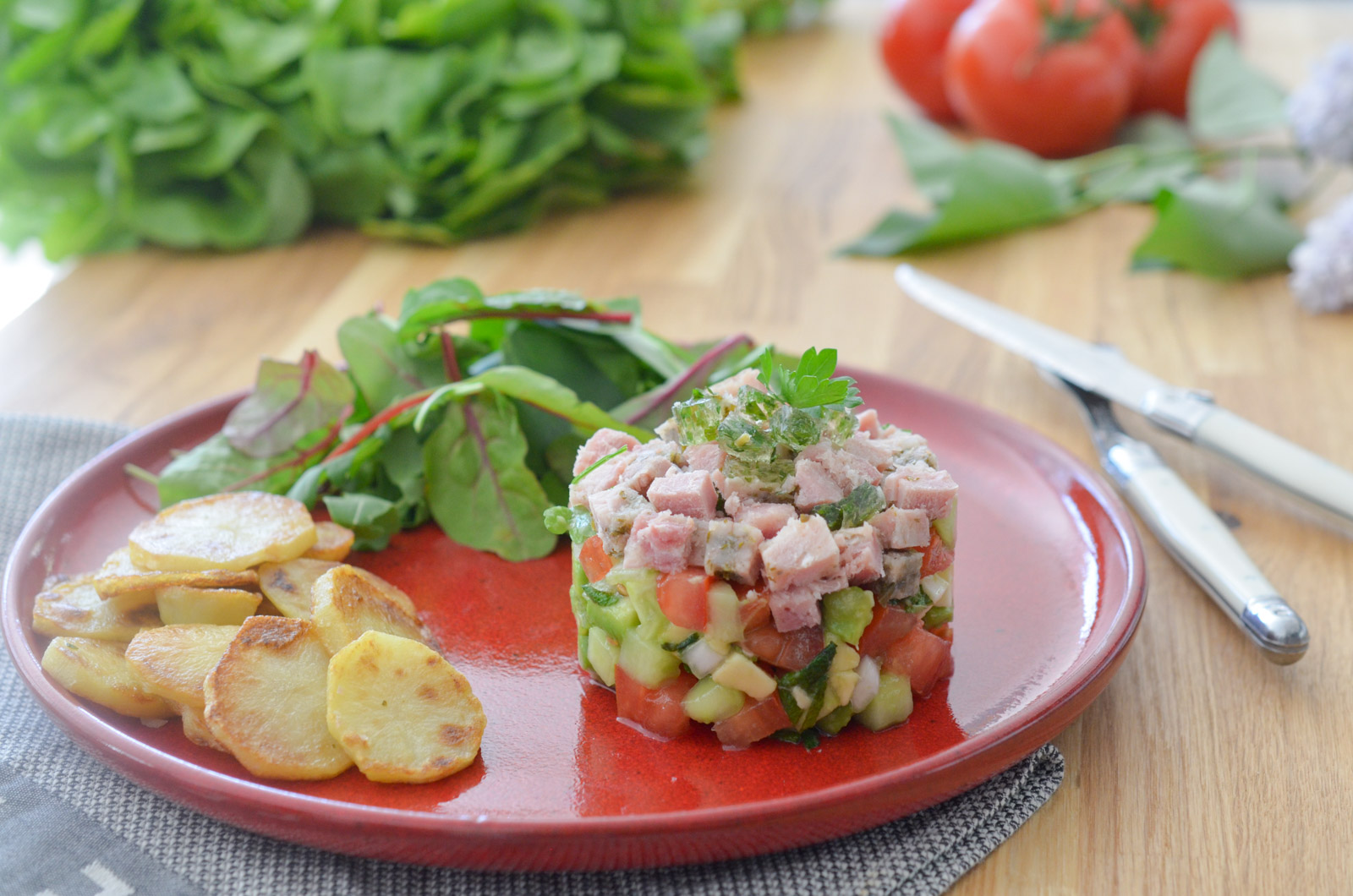 Et si on préparait un tartare… de légumes ! Pas totalement tout légume car j’y ai rajouté du porcillé, une préparation de rillettes de jarret, cuite dans un bouillon de légumes et sans matière grasse ajoutée. Pour étonner un peu vos papilles, j’ai glissé dans ce tartare quelques dés de cerises fraiches qui se sentent à peine mais qui apportent un léger goût sucré salé, légèrement acidulé très agréable, et qui marie très bien avec les câpres et la rondeur en bouche du porcillé.