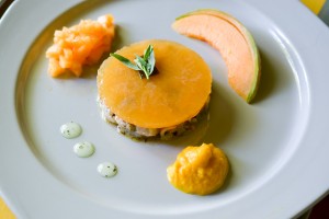 - Autour de votre cercle de tartare, disposez une quenelle de brunoise de melon et votre lamelle de melon. Agrémentez d'une quenelle de sorbet melon (si vous le souhaitez).