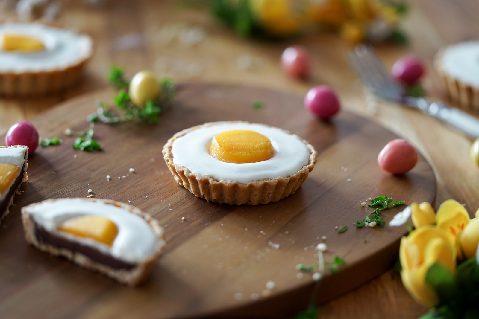 En fait ici, je suis partie d’une pâte à tarte à l’huile de coco garnie d’une ganache choco coco, et d’une mousse légère à la coco. Le résultat est vraiment top et bien équilibré. Pour faire le trompe l’oeil « jaune d’oeuf », j’ai tout simplement utilisé un petit rond de mangue fraiche : rien de plus simple.
