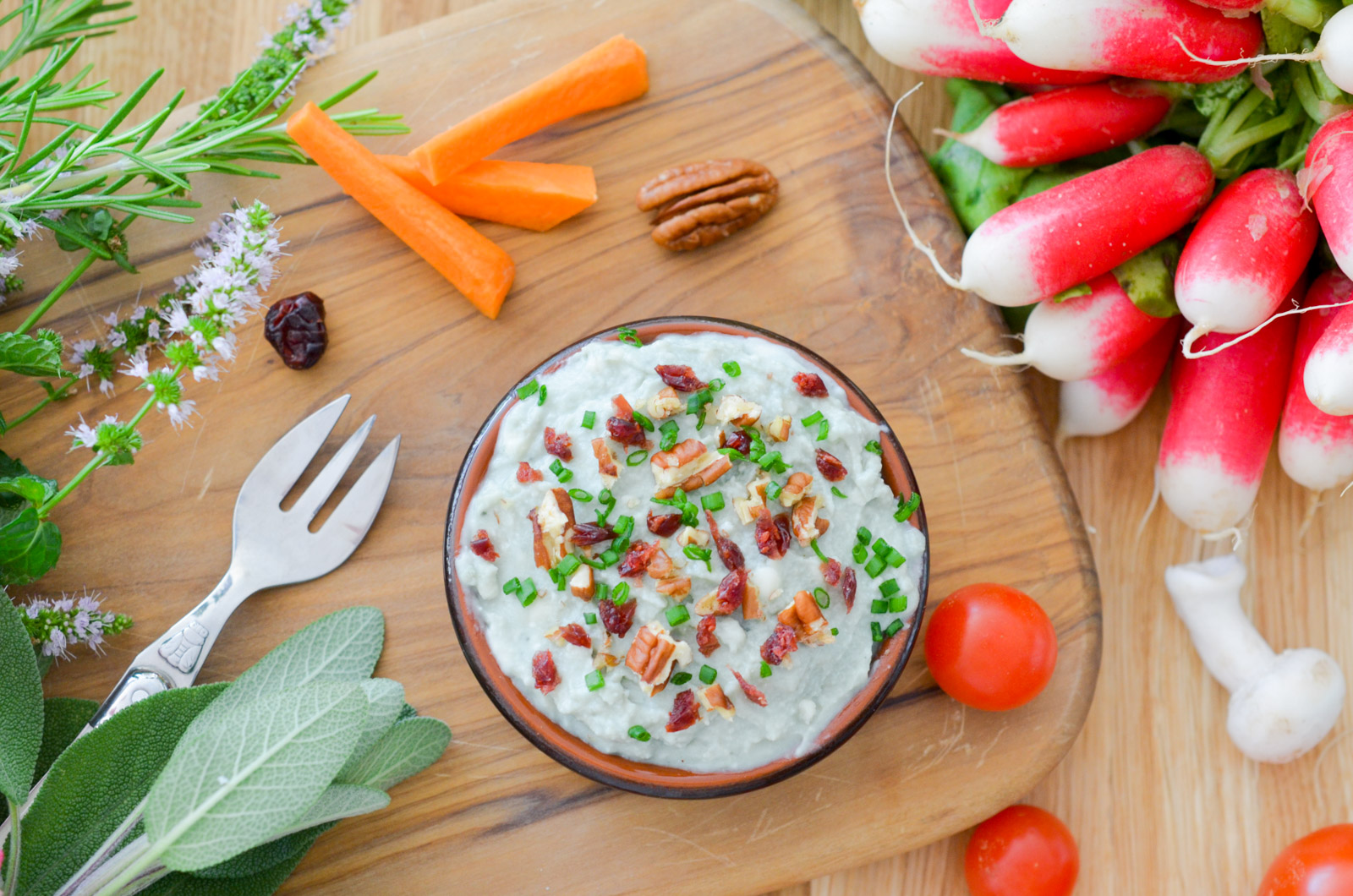 Dans un bol, mélangez le Roquefort avec la crème. Incorporez l’oignon nouveau ciselé, ainsi que le jus de citron. Réservez au frais jusqu’au moment de servir et émiettez les noix de pécan et les cranberries séchées sur le dessus juste au moment de déguster.