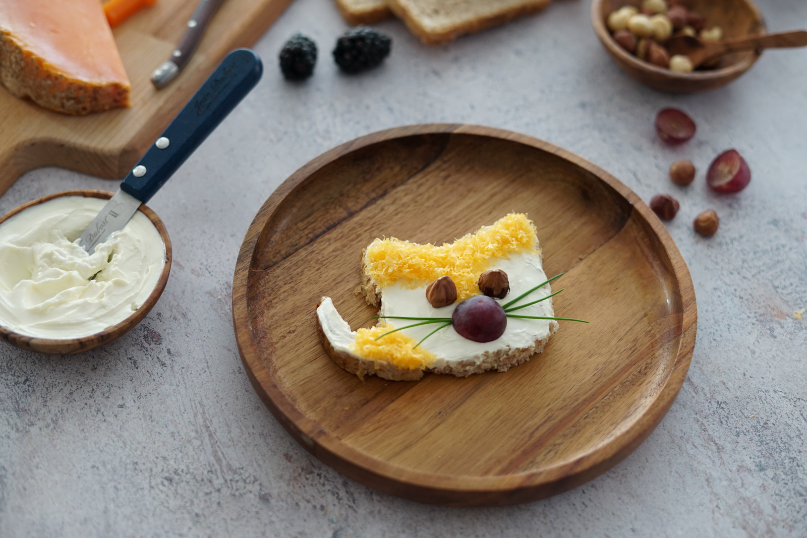 Pour une version sucrée, ajoutez éventuellement une touche de sucre à votre fromage frais et troquez la mimolette contre de la confiture d’abricots, de pêche ou d’orange. Pour les moustaches, dessinez-les avec du chocolat fondu ou des mikados (biscuits).