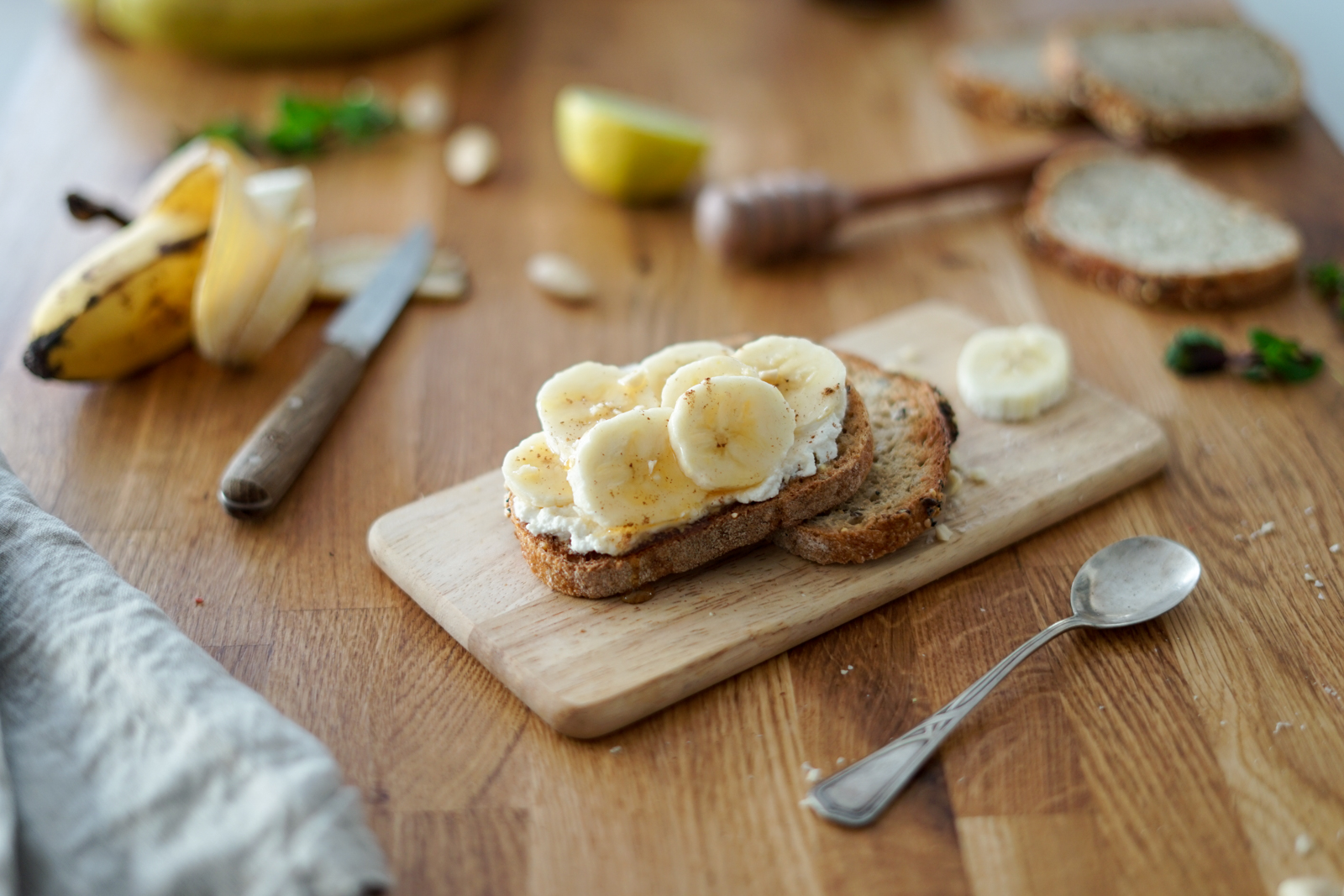 - Tartinez les tranches de pain avec la ricotta. Disposez les rondelles de banane sur le dessus. Arrosez de miel.