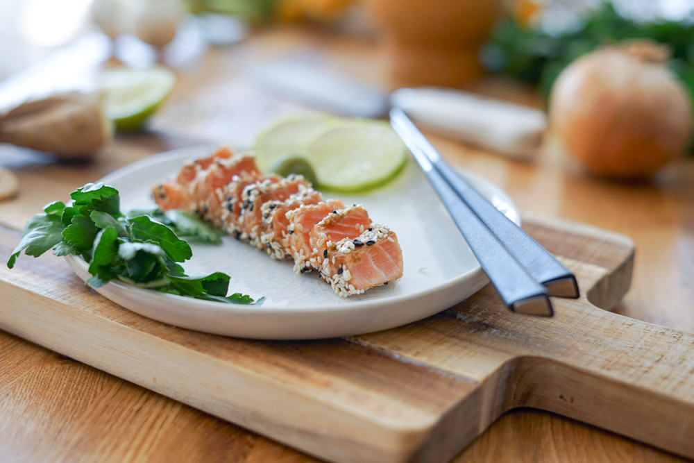- Roulez les pavés de saumon chauds dans les graines de sésame et laisser reposer 3 à 5 minutes au congélateur avant de les couper en fines tranches de 3mm d’épaisseur.