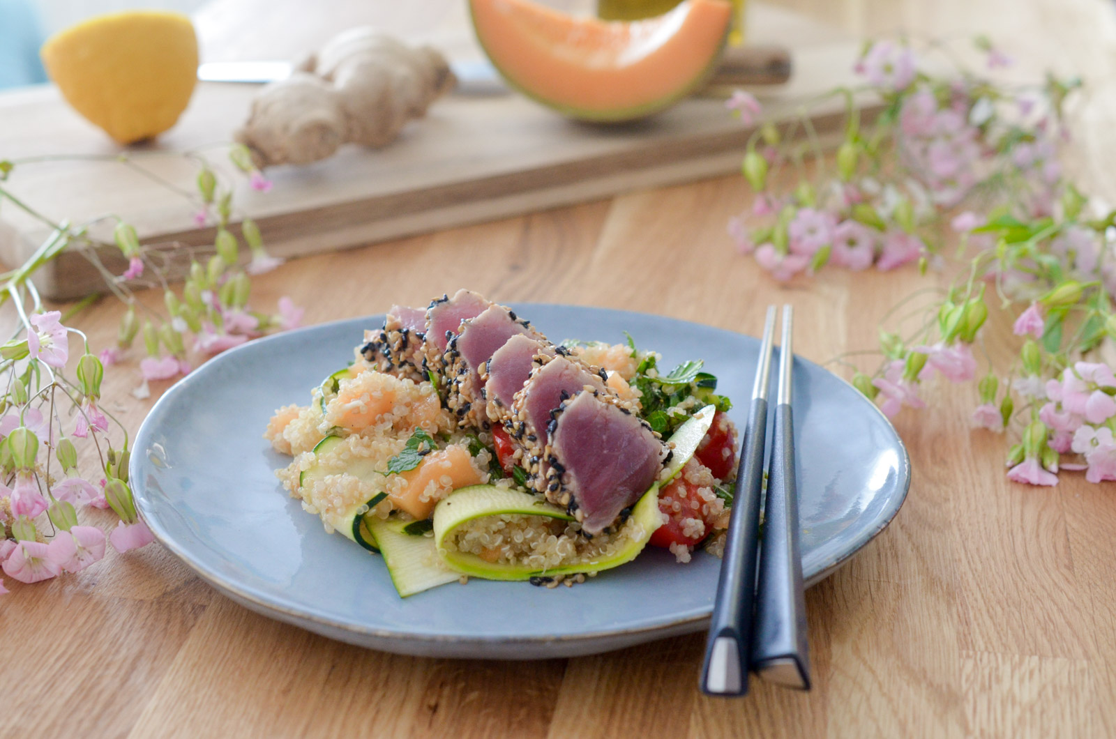 Le tataki est un plat d’origine japonaise, dans lequel du poisson (ou de la viande) est mariné et saisi très rapidement sur une flamme chaude ou à la poêle. Le centre reste cru, et l’extérieur est juste croustillant. Un plat chaud-froid que j’adore, avec un résultat hyper fondant, légèrement vinaigré en bouche, contrebalancé par la douceur de la salade de quinoa au melon.