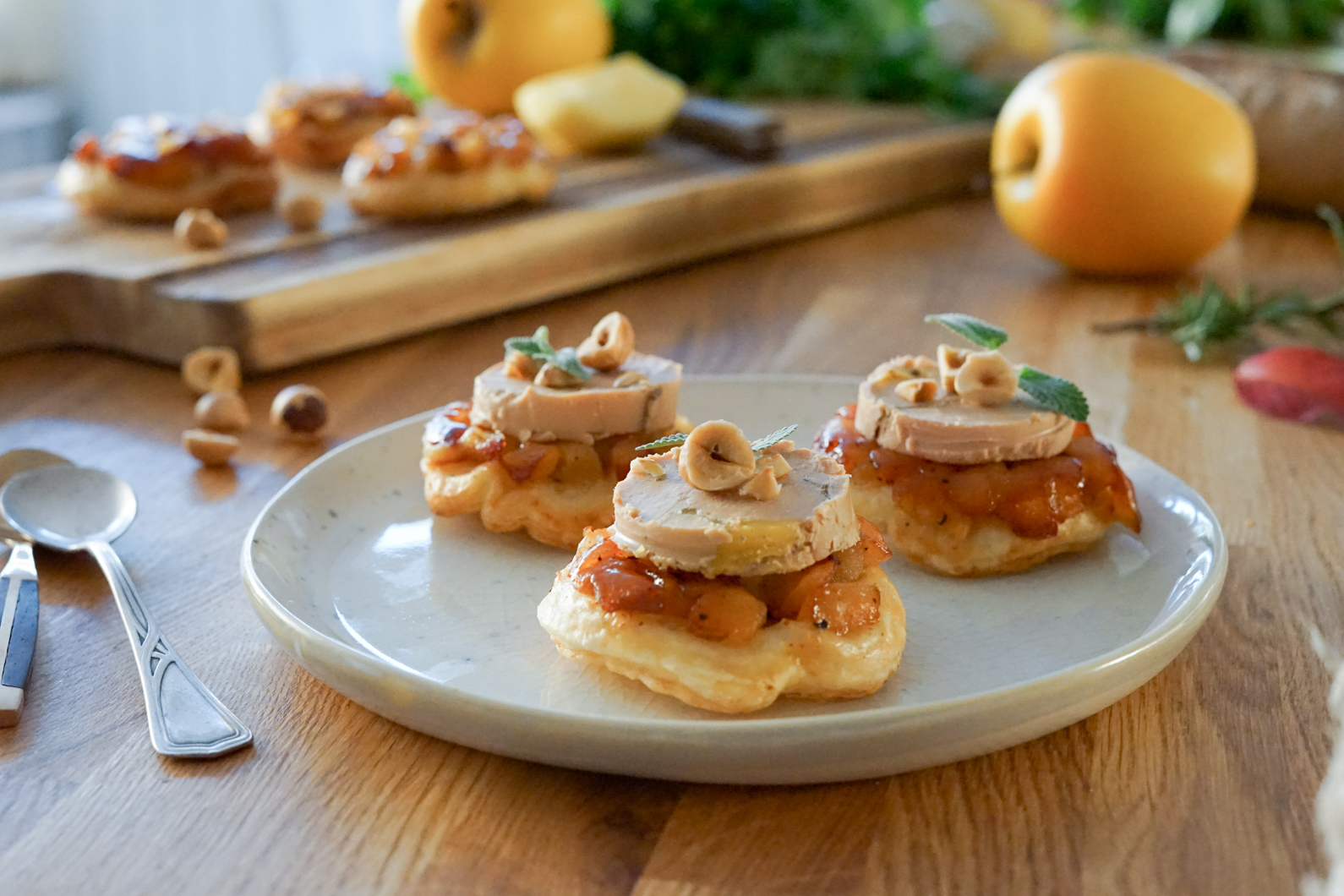 Voici une délicieuse recette bien gourmande spécialement pour les fêtes de fin d’année. Une idée toute simple à faire et facile à préparer mais qui fait son petit effet. Une pâte feuilletée bien croustillante et aérienne, quelques pommes caramélisées et une touche de foie gras déposée sur le dessus en dernière minute.