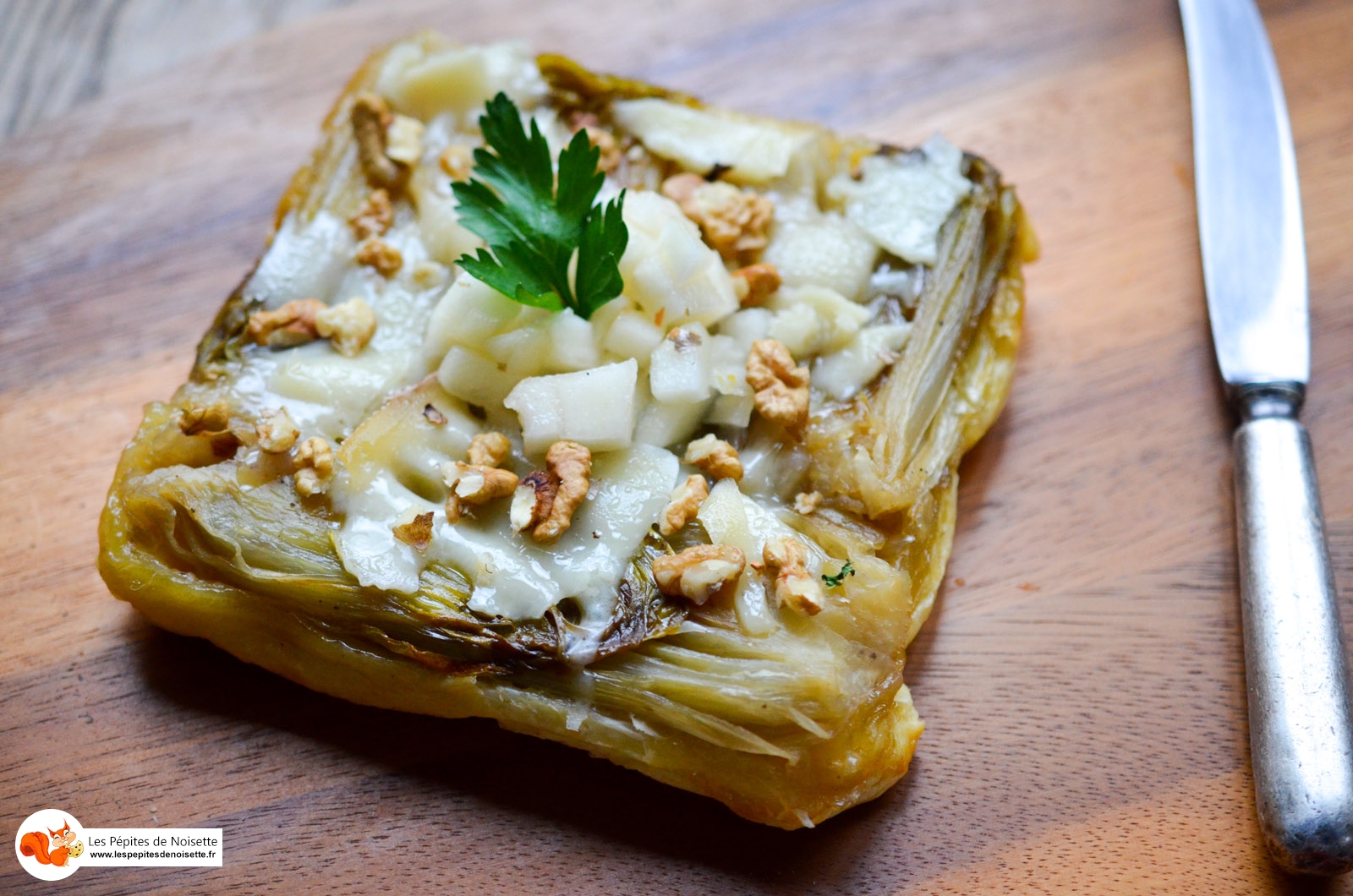Je vous propose là une recette bien de saison. Un mélange de textures très agréable avec le fondant des endives légèrement caramélisées au miel, le moelleux du fromage à peine fondu, la fraîcheur de la poire crue et le croustillant des noix.