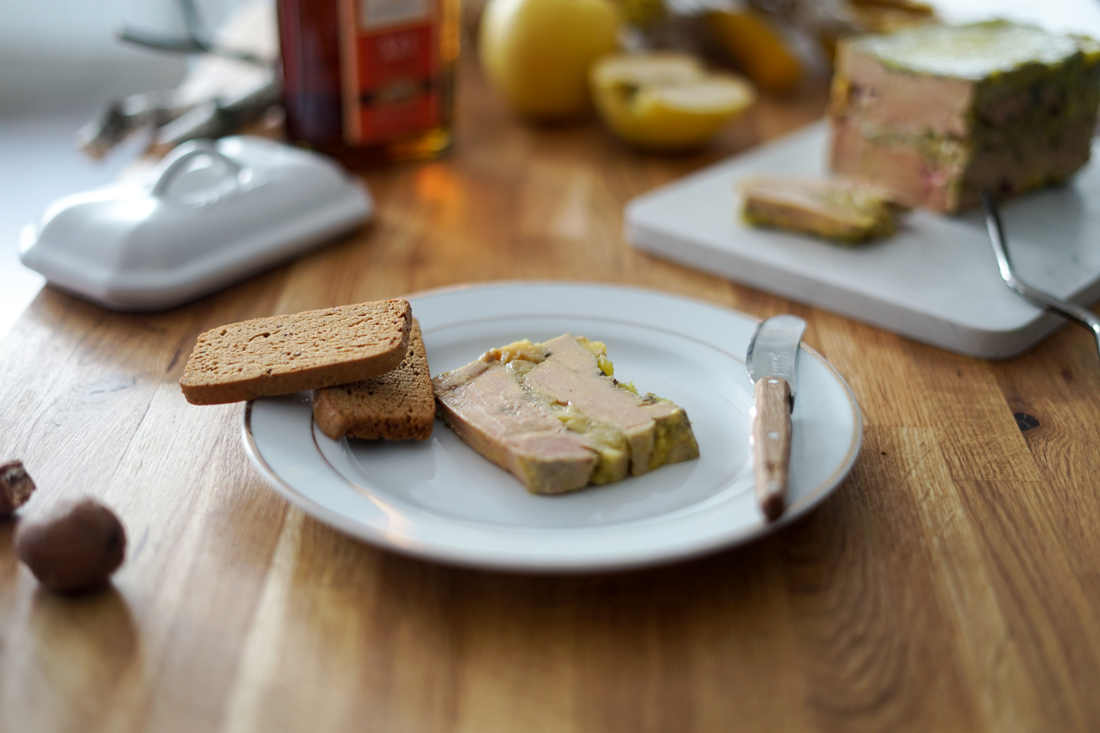 Pour le foie gras, il suffit de procéder de la même façon sans mettre de fruits mais bien une touche d’alcool, c’est meilleur. Il faut diviser les lobes et les superposer sans trous d’air. Belle soirée !