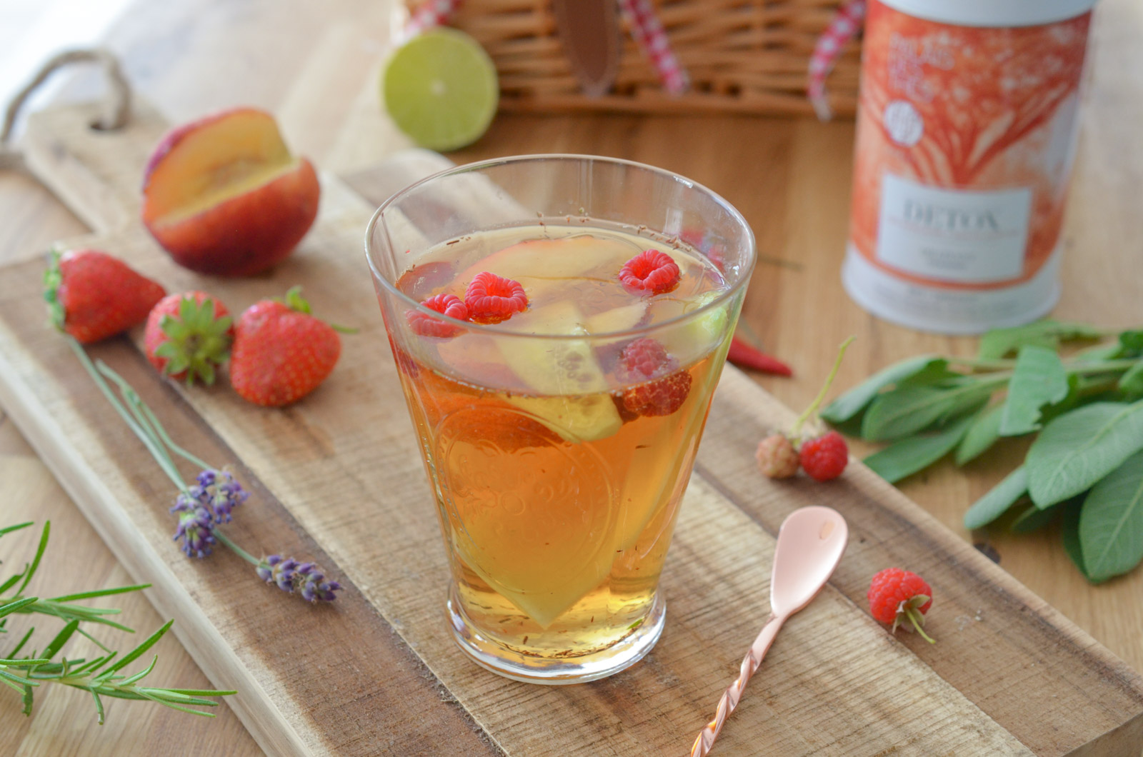 Pour cette version j’ai associé le côté très végétal du thé Sud Africain avec le concombre, la pêche et quelques framboises. Résultat ? Une boisson très fraiche aux propriétés drainantes, à consommer tout au long de la journée sans modération. Je me suis inspirée des célèbres eaux détox, magique tellement c’est frais et agréable ! :-)