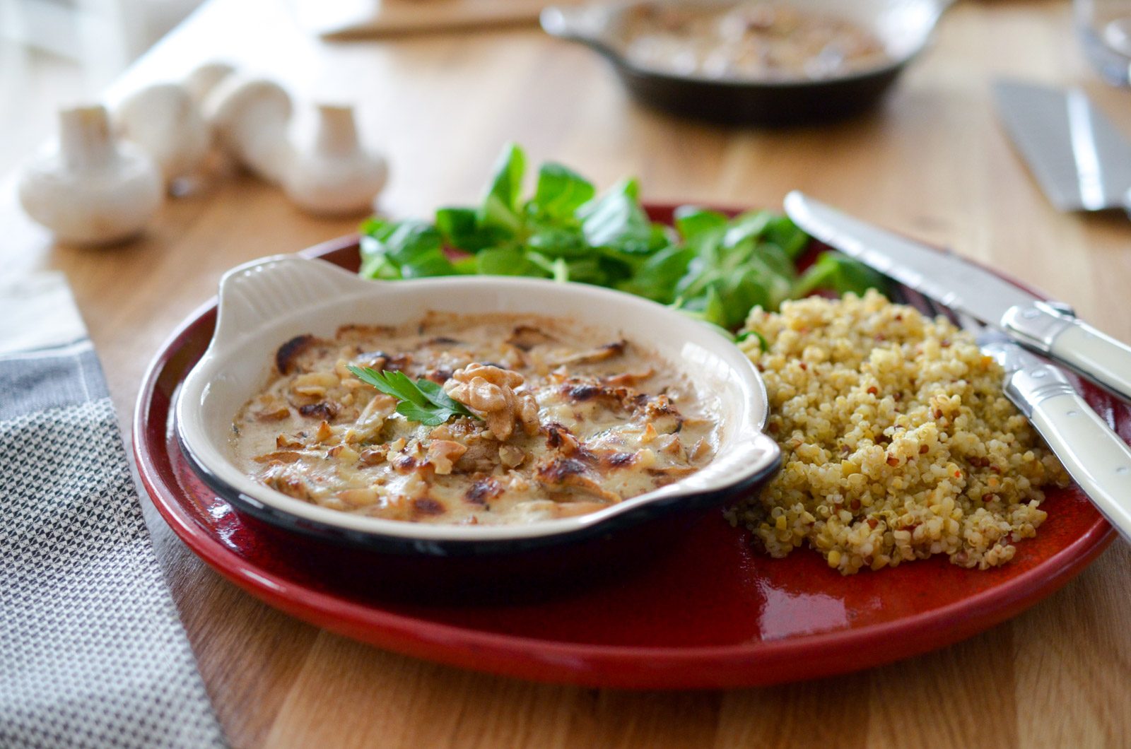 Si vous adorez les tians en été, voici la version hivernale qui saura sans doute vous plaire par sa simplicité et ses saveurs ! Le combo champignon – crème – noix est un classique indémodable. Au lieu de vous occuper à poêler les champignons, tout en veillant à bien les mélanger régulièrement, tout en surveillant la cuisson, il vous suffit ici de mettre les ingrédients dans un plat … et le four s’occupe du reste :-)