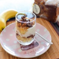 - Dans vos verrines, disposez une couche de pain d'épices, un peu de yaourt puis un peu de purée de banane. Rajoutez un peu de pâte à tartiner. Recommencez l'opération : pain d'épices, yaourt, banane. Terminez par une pointe de yaourt, le reste du pain d'épices et décorez avec des copeaux de chocolat ou une touche de pâte à tartiner.