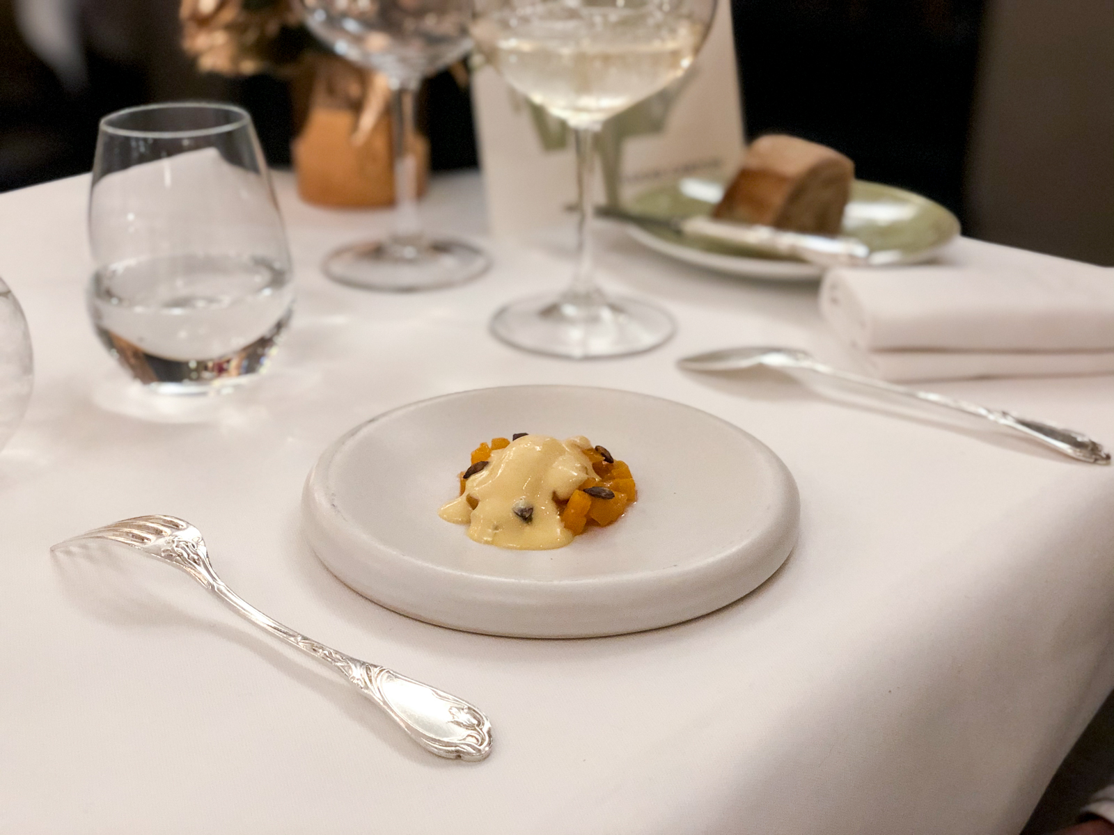 En amuse-bouche, nous avons eu droit à de la butternut, servie en petits dés avec des graines torréfiées, une huile de courge et une sauce rehaussée d’un agrume japonais (il me semble le Shikuwasa un citron vert plat acide originaire d’Okinawa). Une association originale avec une courge encore croquante et bien agréable.