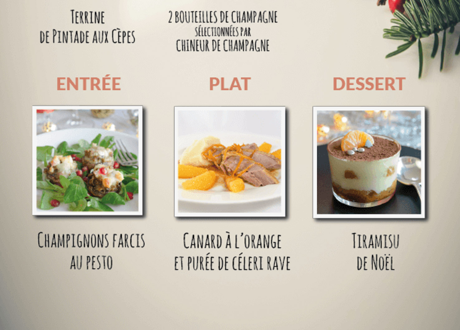 - Pour l’Apéritif : une terrine de pintade aux cèpes, accompagnée de sa bouteille de champagne en accord mets et champagne (accord réalisé par Chineur de Champagne)